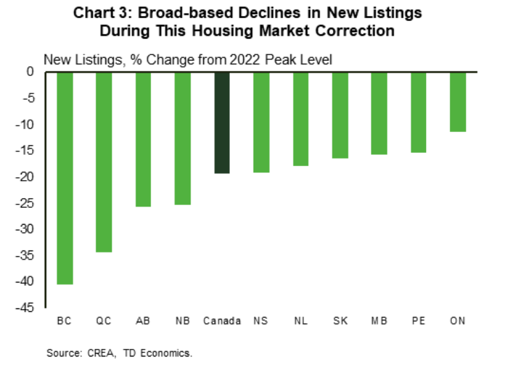 房屋销售的改善趋势是这个故事不可或缺的一部分。然而,一个同样重要的发展是转售供应受到限制,需求仍然疲软的背景使潜在卖家保持观望。自2月份加拿大房地产市场开始调整以来,加拿大的新房源数量下降,同时房屋销售和价格均出现下滑。就幅度而言,它们比去年底的10年平均水平低11%,受到BC省和魁北克省特别急剧下降的拖累。